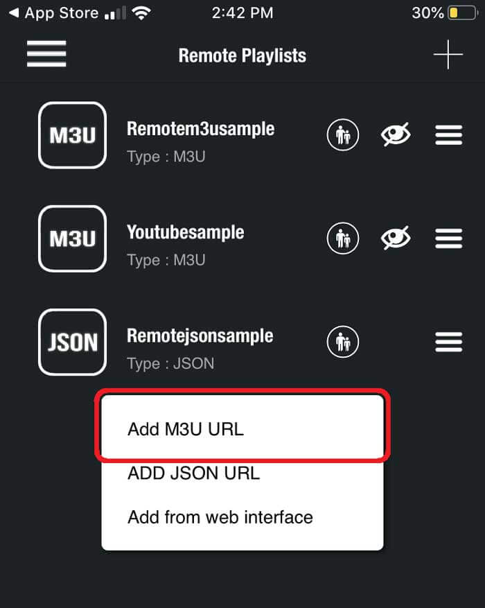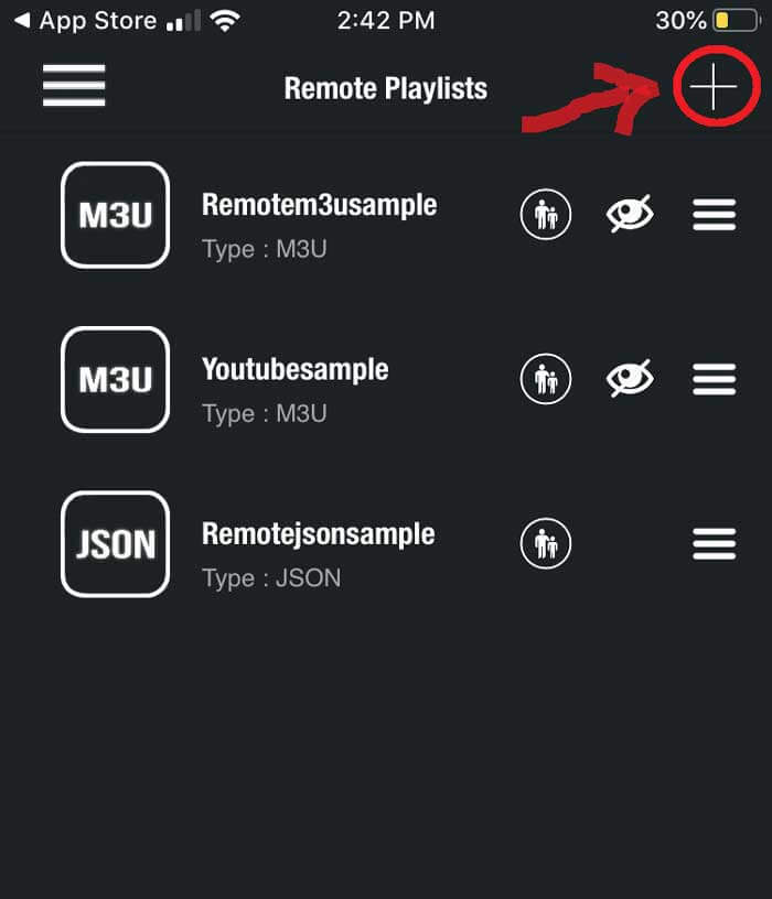 Under the remote playlist section, you will see Plus sign on the upper right-hand side. Press this button. Alternatively, you can go into the menu to add your M3U playlist.